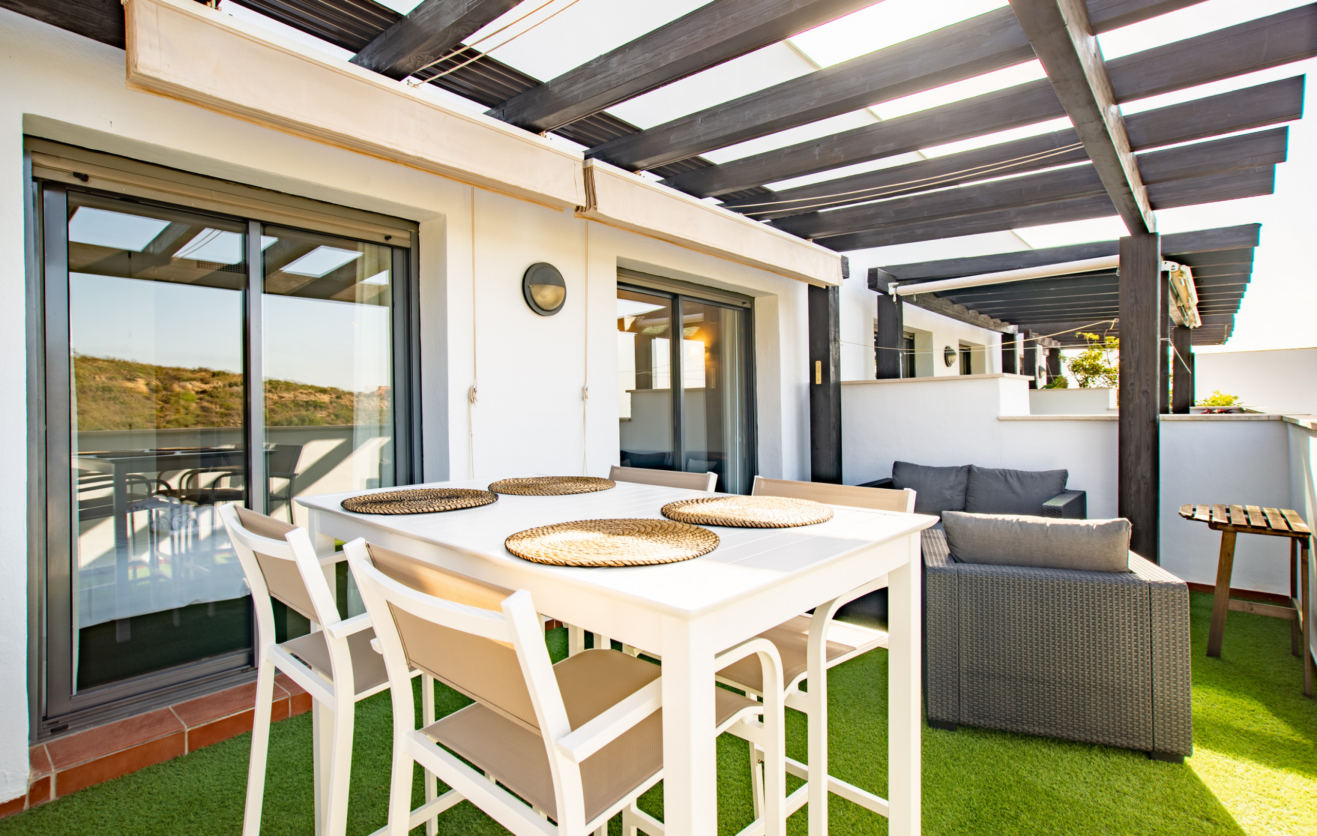 The 21 square metre terrace is south-facing and has awnings. There is a living room and a high dining table with 4 chairs to enjoy the beautiful view.