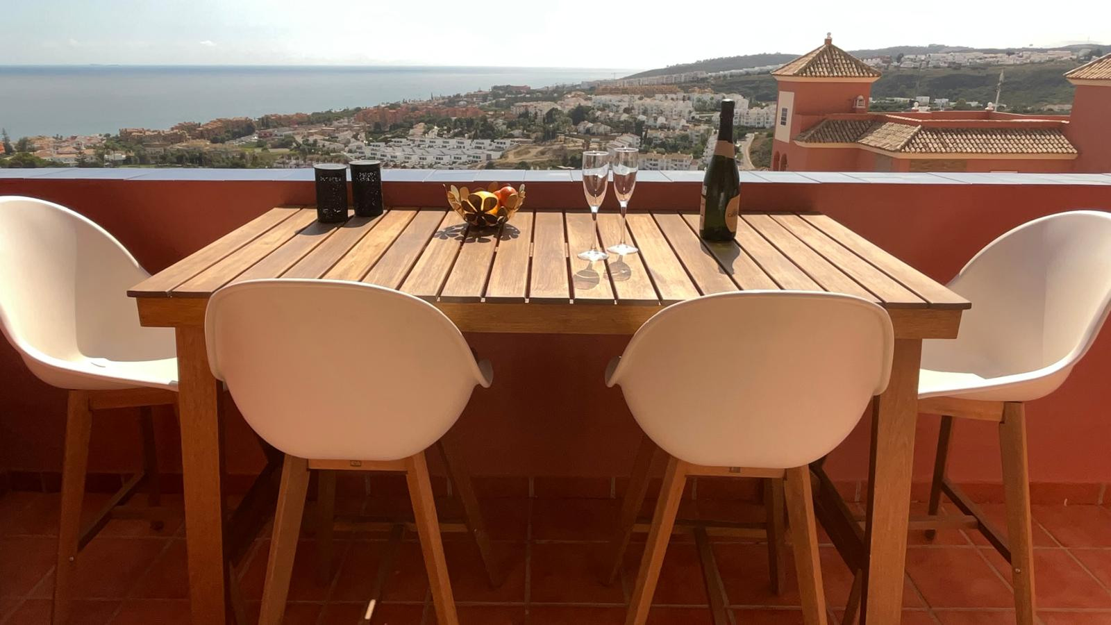 Terras met een spectaculair uitzicht: uitgerust met een zonnescherm, met zicht op het zwembad en de tuinen, met uitzicht op de golfbaan La Duquesa, de zee en de witte daken van de Andalusische huizen.